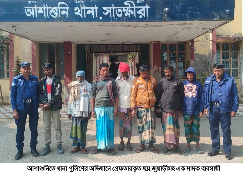 আশাশুনিতে থানা পুলিশের বিশেষ অভিযানে ছয় জুয়াড়ীসহ এক মাদক ব্যবসায়ীকে গ্রেফতার করা হয়েছে। গ্রেফতারকৃতদের মঙ্গলবার (২০ জানুয়ারি) দুপুরে বিজ্ঞ আদালতে প্রেরণ করা হয়েছে। বুধবার দিবাগত গভীর রাতে আশাশুনি থানার অফিসার ইনচার্জ শামীম আহমদ খান নিজে ও থানার সেকেন্ড অফিসার এসআই রাশেদুজ্জামান অভিযান চালিয়ে শোভনালী ইউনিয়নের মোঃ আশরাফুল এর চায়ের দোকান থেকে বৈকরঝুটি গ্রামের মৃত কৃষ্ণপদ সরকারের ছেলে প্রশান্ত সরকার (৫৬), মৃত কোমল কৃষ্ণ সরকারের ছেলে মানিক সরকার (৪৬), ফজর আলী গাজীর ছেলে আবু হাসান গাজী (৪২), আঃ গফুর সরদারের ছেলে সেলিম রেজা (৩২)। শোভনালী গ্রামের মৃত সোহেল উদ্দিন সরদারের ছেলে মুজিবর সরদার (৫৬) ও মৃত জামাল উদ্দিন সরদারের ছেলে আকবর আলী (৪৭)কে গ্রেফতার করেন। এ সংক্রান্তে ১৮৬৭ সালের প্রকাশ্য জুয়া আইনের ৩/৪ ধারা