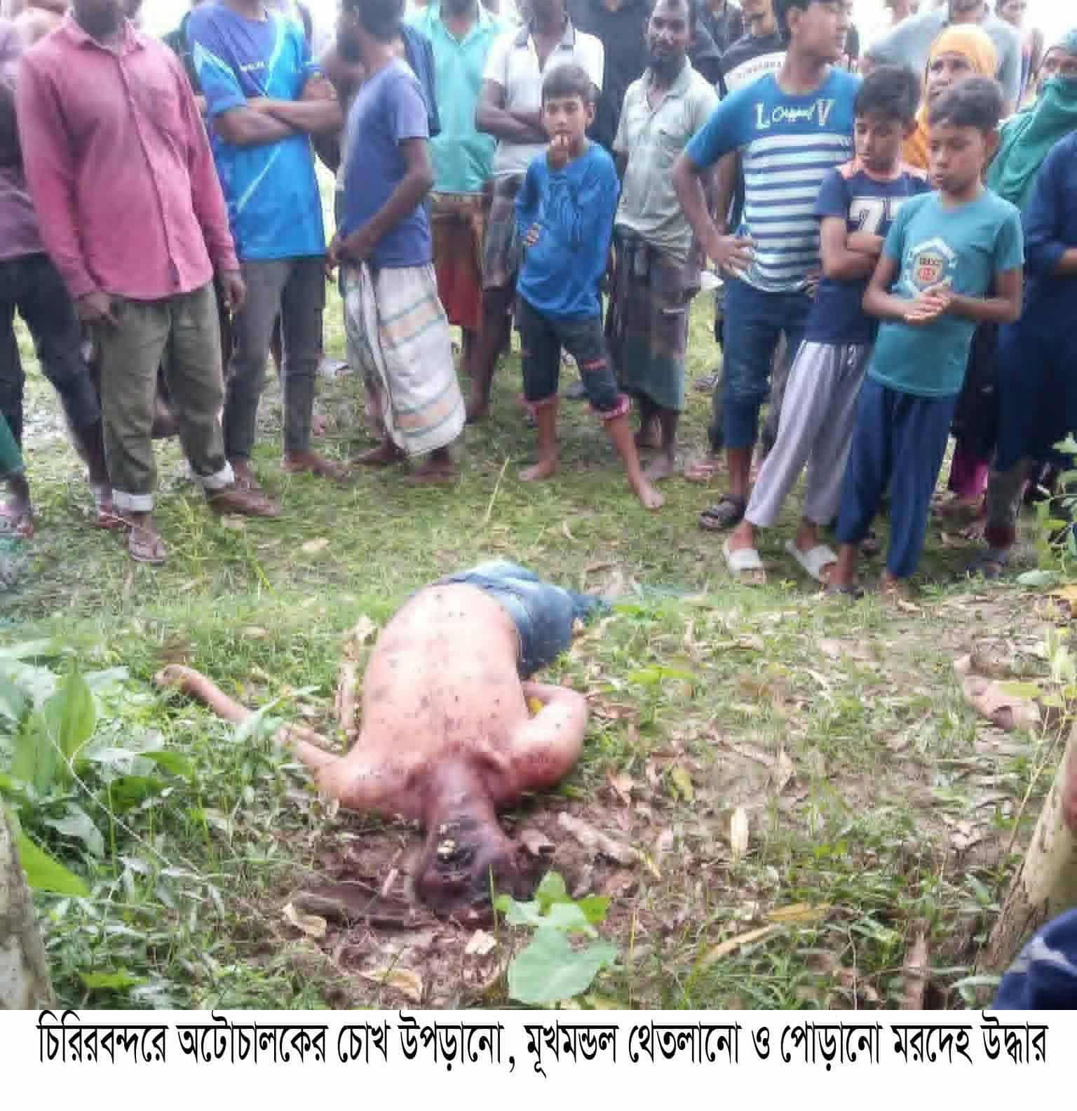 দিনাজপুর জেলার চিরিরবন্দরে অটোচালকের চোখ উপড়ানো, মূখমন্ডল থেতলানো ও পোড়ানো মরদেহ উদ্ধার করেছে চিরিরবন্দর থানা পুলিশ। রবিবার ৭ সেপ্টেম্বর বিকেল সাড়ে ৩ টায় উপজেলা ইসবপুর ইউনিয়নের বিন্যাকুড়ি তালদিঘীরপাড় এলাকার ইউক্যালিপ্টাস বাগানে এ মরদেহ উদ্ধার করা হয়।