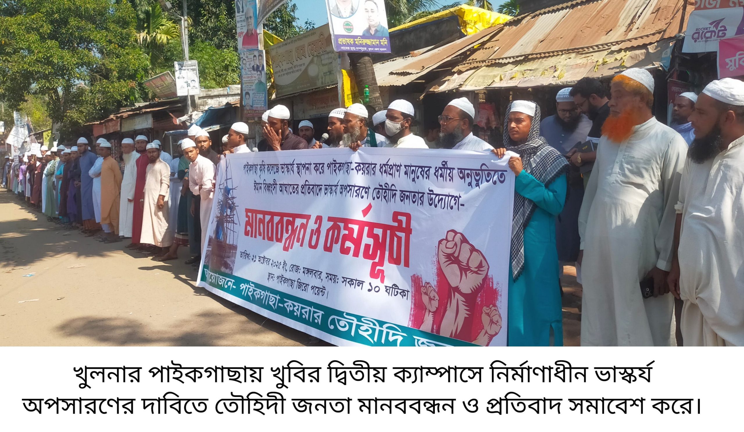 খুলনার পাইকগাছায় খুলনা বিশ্ববিদ্যালয়ের দ্বিতীয় ক্যাম্পাসে নির্মাণাধীন ভাস্কর্য ৭২ ঘন্টার মধ্যে অপসারণের জন্য আল্টিমেটাম দিয়েছে তৌহিদী জনতা। ২১ অক্টোবর মঙ্গলবার সকালে মানববন্ধন ও প্রতিবাদ সমাবেশে সরকার কে ৭২ ঘন্টার সময় বেঁধে দেয় ওলামা মশায়েখ সহ বিক্ষুদ্ধ জনতা। নির্মাণাধীন ভাস্কর্য ধর্মপ্রাণ মানুষের ধর্মীয় অনুভূতিতে ঈমান বিধ্বংসী আঘাত এনেছে উল্লেখ করে বক্তারা বলেন ৫ আগস্ট জুলাই গণঅভ্যুত্থান আনদোলনে ভাস্কর্যের রাজনীতি শেষ হয়ে গেছে। এদেশে আর কোন দিন ভাস্কর্য রাজনীতির ঠাই হবে না। বক্তারা নির্মাণাধীন ভাস্কর্য অপসারণ করার জন্য ৭২ ঘন্টার সময় বেঁধে দেন। নির্দিষ্ট সময়ের মধ্যে অপসারণ করা না হলে কঠোর আন্দোলনের হুশিয়ারী দিয়ে বক্তারা বলেন তখন এর দায় দায়িত্ব সরকার নিতে হবে। পাইকগাছা কয়রা তৌহিদী জনতা আয়োজিত মানববন্ধন কর্মসূচিতে সভাপতিত্ব করেন মাওলানা আব্দুল আজিজ। বক্তব্য রাখেন হাফেজ মাওলানা আব্দুর রব, মুফতি ওয়াইস কুরনী, মাওলানা মনিরুল ইসলাম, হাফেজ মাওলানা শামসুদ্দিন, মাওলানা রইসুল ইসলাম, মাওলানা সাঈদুর রহমান, শরিফুল ইসলাম, আসাদুল্লাহ, আতাউল গণি, ইলিয়াস আমিন ও ফরহাদ হুসাইন সহ বিভিন্ন ওলামা মশায়েখ গণ। উল্লেখ্য পাইকগাছাস্থ খুলনা বিশ্ববিদ্যালয়ের অধিভুক্ত দ্বিতীয় ক্যাম্পাসের ভিতরে মুক্তিযুদ্ধের স্মৃতি সংরক্ষণের অংশ হিসেবে একটি মুক্তিযুদ্ধের ভাস্কর্য নির্মাণ করছিল সংশ্লিষ্ট কর্তৃপক্ষ। এটা নিয়ে নানান প্রশ্ন উঠলে বিশ্ববিদ্যালয় কর্তৃপক্ষ ও শিক্ষা প্রকৌশল অধিদপ্তর যৌথভাবে আলোচনা করে নির্মাণ কাজ বন্ধ রেখে নির্মাণাধীন ভাস্কর্য পলিথিন দিয়ে ঢেকে রাখে।