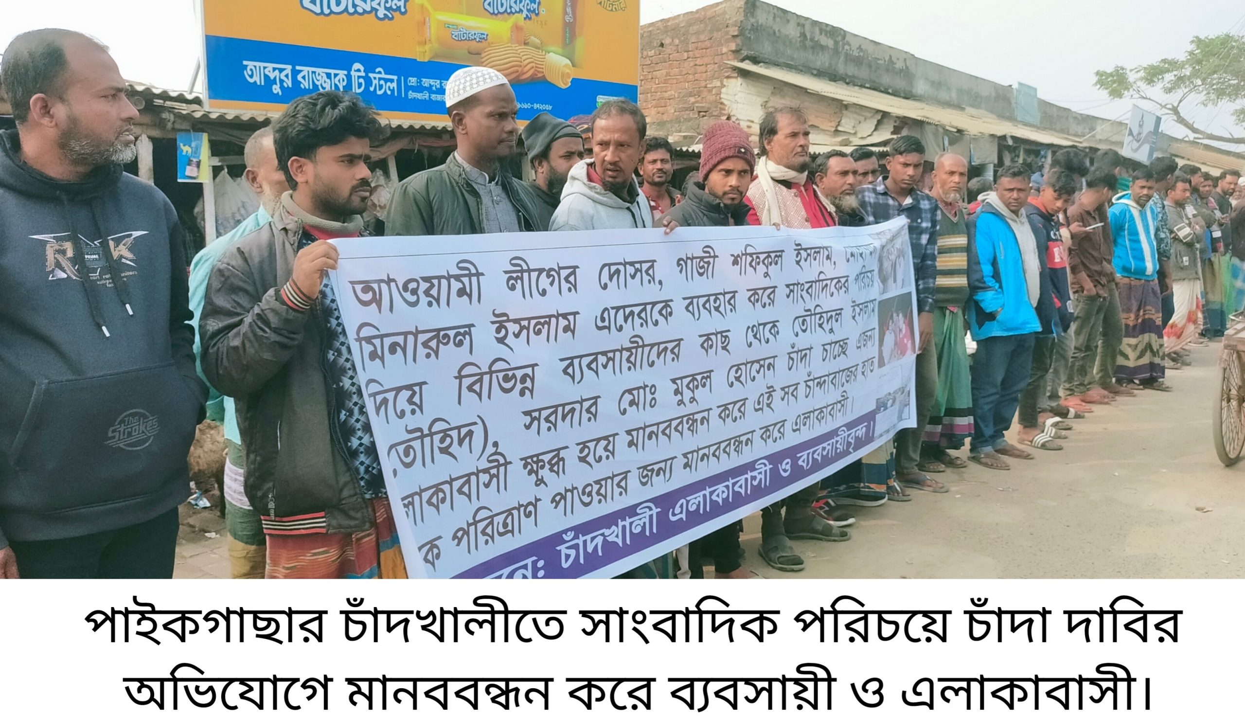 খুলনা পাইকগাছায় সাংবাদিক পরিচয়ে চাঁদা দাবির অভিযোগে মানববন্ধন করেছে ব্যবসায়ী সহ সাধারণ মানুষ। ৪ জানুয়ারি রোববার দুপুরে উপজেলার চাঁদখালী বাজারের প্রধান সড়কে মানববন্ধন কর্মসূচির আয়োজন করে ব্যবসায়ী ও এলাকাবাসী। মানববন্ধন কর্মসূচিতে ব্যবসায়ীরা অভিযোগ করেন স্থানীয় আওয়ামী দোসর গাজী শফিকুল ইসলাম ও মিনারুল ইসলাম কে ব্যবহার করে তৌহিদুল ইসলাম ও মুকুল হোসেন সহ কতিপয় ব্যক্তি এলাকার বিভিন্ন ব্যবসায়ীদের কাছে চাঁদা দাবি করছে। তাদের এ ধরনের কর্মকাণ্ডে অতিষ্ঠ হয়ে উঠেছেন এবং এব্যাপারে প্রয়োজনীয় ব্যবস্থা গ্রহণে প্রশাসন সহ সংশ্লিষ্ট কতৃপক্ষের আশু হস্তক্ষেপ কামনা করেন ব্যবসায়ী সহ সাধারণ মানুষ। ইটভাটা ব্যবসায়ী খলিলুর রহমান গাজীর সভাপতিত্বে মানববন্ধনে বক্তব্য রাখেন মনিরুল ইসলাম, আবু সুফিয়ান টিক্কা, পরিতোষ কুমার, আবেদা খাতুন, ইউনুস আলী সরদার, বজলুর রহমান, বাদশা গাজী, নজরুল গাজী, লুৎফর রহমান, জলিল সরদার, আকবর সরদার, জুয়েল গাজী, রিপন মোল্লা, চয়ন সরদার, সোহেল গাজী, তালেব মোল্লা, নাজমুল হোসেন, মনিরুল গাজী, মুন্না, রসুল সরদার, জয়নাল সরদার, ফরিদ হোসেন ও বেলাল হোসেন। মানববন্ধনে এলাকার শতশত নারী পুরুষ ও ব্যবসায়ীরা অংশগ্রহণ করেন।