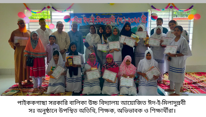 খুলনার পাইকগাছা সরকারি বালিকা উচ্চ বিদ্যালয়ে পবিত্র ঈদ-ই-মিলাদুন্নবী সঃ পালিত হয়েছে। এ উপলক্ষে আলোচনা সভা, রচনা, হামদ্, নাথ ও কেরাত প্রতিযোগিতার আয়োজন করা হয়। শনিবার সকালে বিদ্যালয় মিলনায়তনে প্রধান শিক্ষক আব্দুল ওহাব এর সভাপতিত্বে ও শিক্ষক শেখ বোরহান উদ্দিন এর সঞ্চালনায় অনুষ্ঠানে নবীর জীবনের উপর আলোচনা করেন প্রাক্তন প্রধান শিক্ষক সুরাইয়া বানু ডলি, মাওলানা আব্দুল হান্নান ওমর, হাফেজ মাওলানা ওমর ফারুক, শিক্ষক জোবাইরিয়া আক্তার, প্রেসক্লাবের সহ সভাপতি মোঃ আব্দুল আজিজ, অভিভাবক হাফিজুর রহমান, গুলজার মোড়ল, মোড়ল কওসার আলী, শিক্ষার্থী আকসারা নেওয়াজ চাহাত, সৈয়দা তানহা জেরিন মৌ, সুমাইয়া খাতুন, জান্নাতুল ফেরদৌস রশ্মি, আরশিয়া বিনতে ওহাব, আহমদ আব্দুর রহমান বিন ওহাব ও সেজুতি সরকার। অনুষ্ঠানে রচনা, হামদ, নাথ ও কেরাত প্রতিযোগিতার বিজয়ী শিক্ষার্থীদের মাঝে পুরস্কার ও সনদপত্র বিতরণ করা হয়।