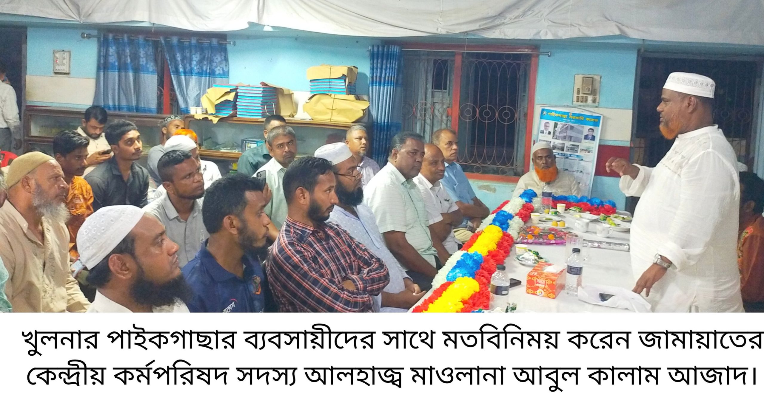 বাংলাদেশ জামায়াতে ইসলামীর কেন্দ্রীয় কর্মপরিষদ সদস্য ও খুলনা অঞ্চলের সহকারী পরিচালক আলহাজ্ব মাওলানা আবুল আজাদ বলেছেন দেশের মানুষ অবাধ, সুষ্ঠু, নিরপেক্ষ এবং একটি অংশগ্রহণমূলক নির্বাচন চাই। এর জন্য পিআর পদ্ধতির নির্বাচনের বিকল্প নাই উল্লেখ করে খুলনা -৬ আসনের জামায়াত মনোনীত এমপি azaপ্রার্থী আবুল কালাম আজাদ বলেন পিআর পদ্ধতির নির্বাচন হলে মনোনয়ন বাণিজ্য থাকবে না। তিনি বলেন মনোনয়ন বাণিজ্য বন্ধ হলে নির্বাচনের পর নির্বাচিত এমপিরা অনিয়ম দূর্নীতির সাথে জড়াবে না। পিআর পদ্ধতি বিশ্বের ৯১ টি দেশে রয়েছে উল্লেখ করে তিনি বলেন দেশের মানুষ আর এক দলীয় শাসন ব্যবস্থা দেখতে চাই না। জনমত ও পিআর পদ্ধতির পক্ষে রয়েছে উল্লেখ করে তিনি বলেন যদি কেউ জনগণের মতামত উপেক্ষা করে এক তরফা নির্বাচন করে ক্ষমতায় যেতে চাই। তাদের প্রত্যাশা কখনো সফল হবে না এবং জনগণ তাদের কে প্রত্যাখ্যান করবে। তিনি বুধবার সন্ধ্যায় পাইকগাছায় ষোলআনা ব্যবসায়ী সমবায় সমিতি কার্যালয়ে ব্যবসায়ীদের সাথে মতবিনিময়কালে এসব কথা বলেন। তিনি সৎ নেতৃত্ব গড়ে তুলতে, মানুষের জানমাল নিরাপত্তা নিশ্চিত এবং সাম্প্রদায়িক সম্প্রীতির বাংলাদেশ বিনির্মানে আগামী ত্রয়োদশ জাতীয় সংসদ নির্বাচনে দাঁড়িপাল্লা প্রতীকে ভোট দিতে জনসাধারণের প্রতি আহবান জানান। ষোলআনা ব্যবসায়ী সমবায় সমিতির সভাপতি জিএম শুকুরুজ্জামান এর সভাপতিত্বে ও বাজার বস্ত্র ব্যবসায়ী সমবায় সমিতির সাধারণ সম্পাদক মুহাম্মদ শফিয়ার রহমানের সঞ্চালনায় সভায় বক্তব্য রাখেন জেলা জামায়াতের কর্মপরিষদ সদস্য আলহাজ্ব মাওলানা আমিনুল ইসলাম, শিবিরের জেলা সভাপতি আবুজার গিফারী, জামায়াতের পৌর নায়েবে আমীর সম আব্দুল্লাহ আল মামুন, ব্যবসায়ী সাজ্জাত আলী সরদার, আনোয়ার হোসেন, ইলিয়াস হোসেন, মনোহর চন্দ্র সানা, মধুরঞ্জন কর্মকার, সুনীল মন্ডল, কার্তিক চন্দ্র দেবনাথ, আলহাজ্ব মুরশাফুল আলম, নাসির হোসেন, মোশাররফ হোসেন, মন্টু কাগজী, এনামুল হক, শাহীন, রাব্বু ইসলাম দিপু, আমিনুল ইসলাম বজলু, মইনুল ইসলাম, ও মনিরুল ইসলাম।